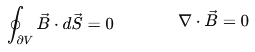 ![]() (On donnera de la même façon les formes intégrales et différentielles pour les trois autres lois. NB : le point (.) désigne le produit scalaire, le lambda majuscule (Λ) désigne le produit vectoriel. Le symbole ∇ (nabla) peut désigner différents opérateurs : ∇. = divergence (div); ∇Λ = rotationnel (rot)).Loi de Gauss pour le magnétisme. Il n'existe pas de monopôles magnétiques. La deuxième équation, la loi de Gauss pour le magnétisme, stipule que les distributions des sources magnétiques sont toujours neutres dans le sens où elles ont un pôle nord et un pôle sud, autrement dit que le flux du champ magnétique à travers n'importe quelle surface fermée est toujours nul. Cela traduit mathématiquement le fait qu'il n'existe pas de monopôles magnétiques. Les lignes de champ magnétique se referment toujours sur elles-mêmes, formant des boucles continues. - ![]() Loi de l'induction